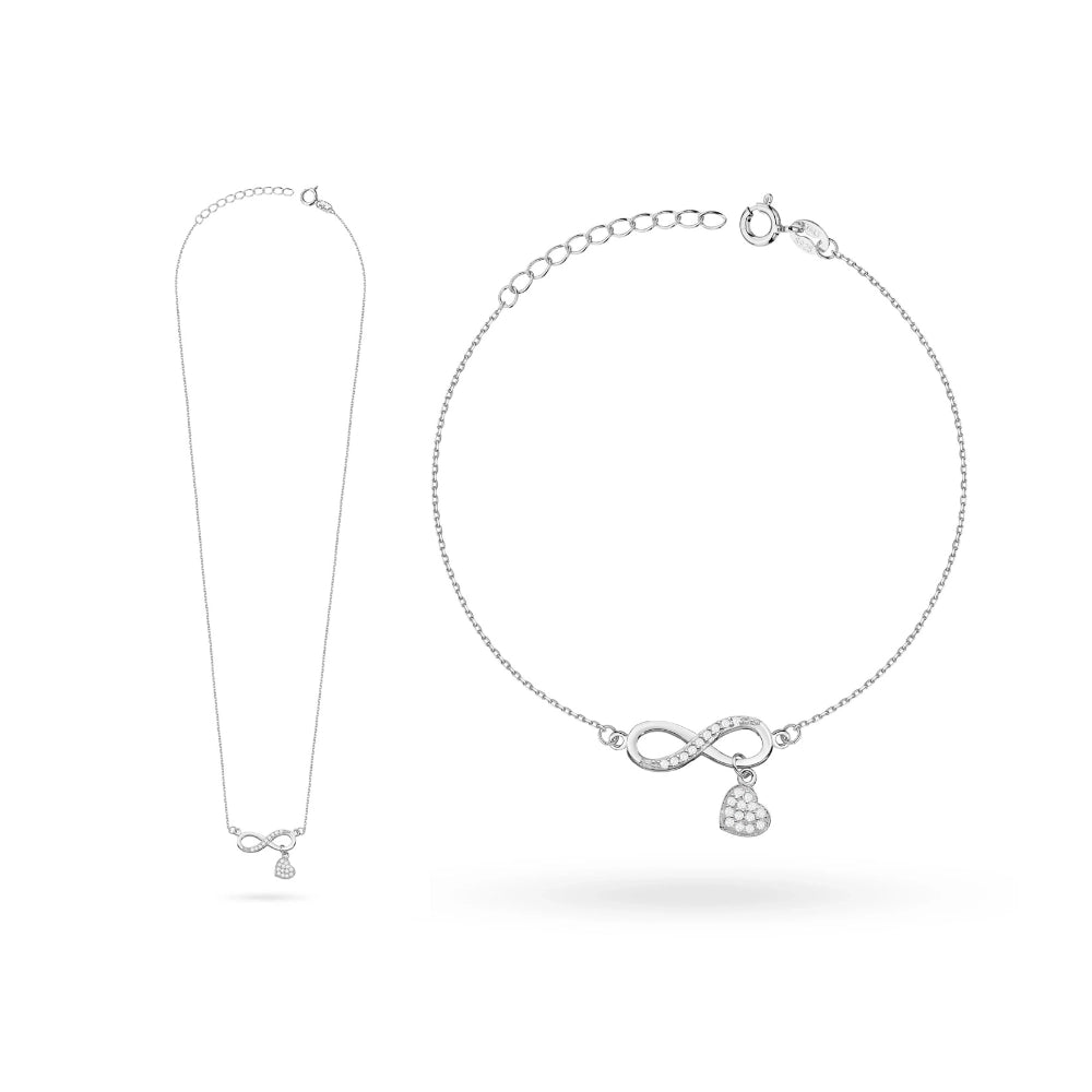 Silver necklace and bracelet set — infinity symbol with heart and cubic zirconia