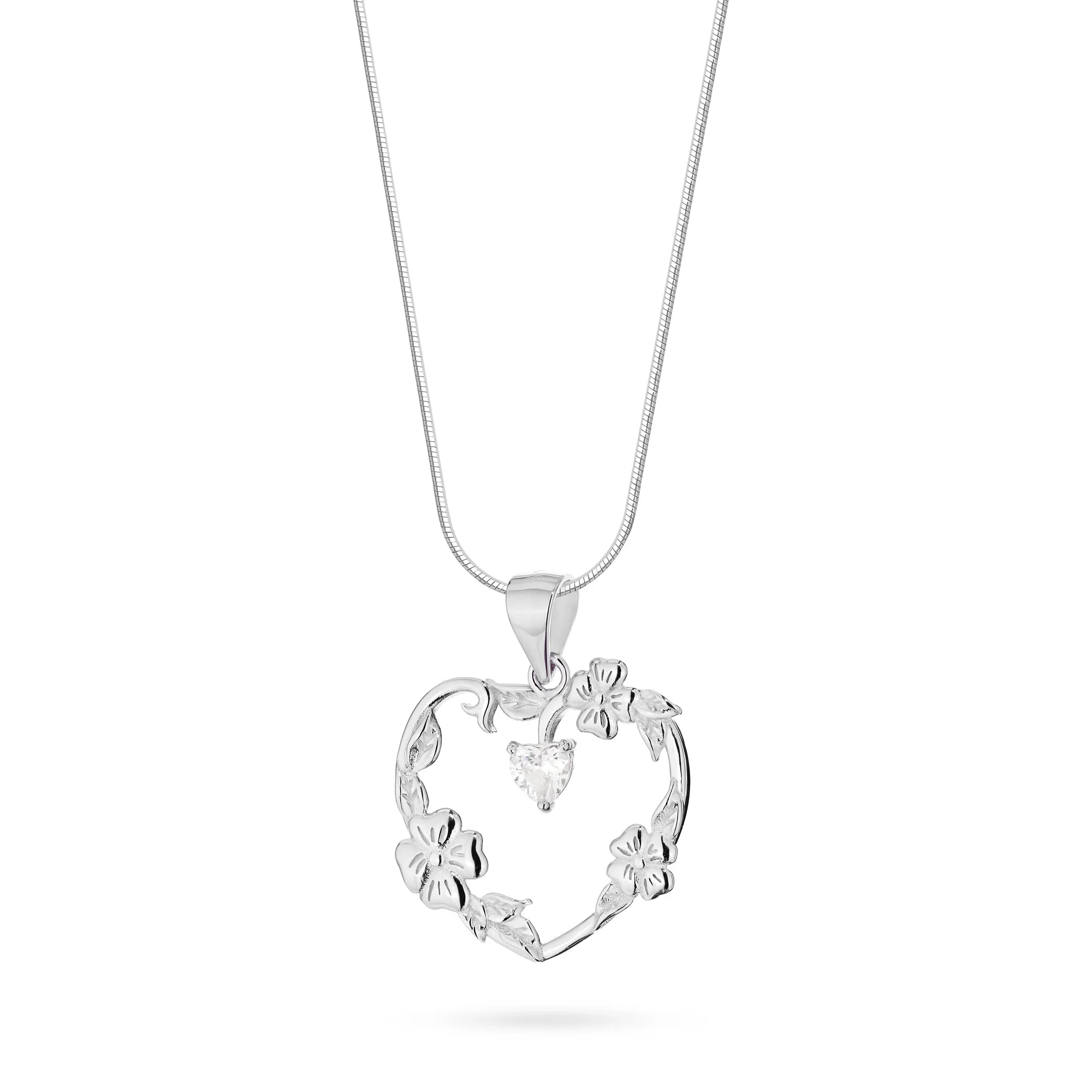 Silver Necklace with Braided Floral Heart Pendant and Cubic Zirconia