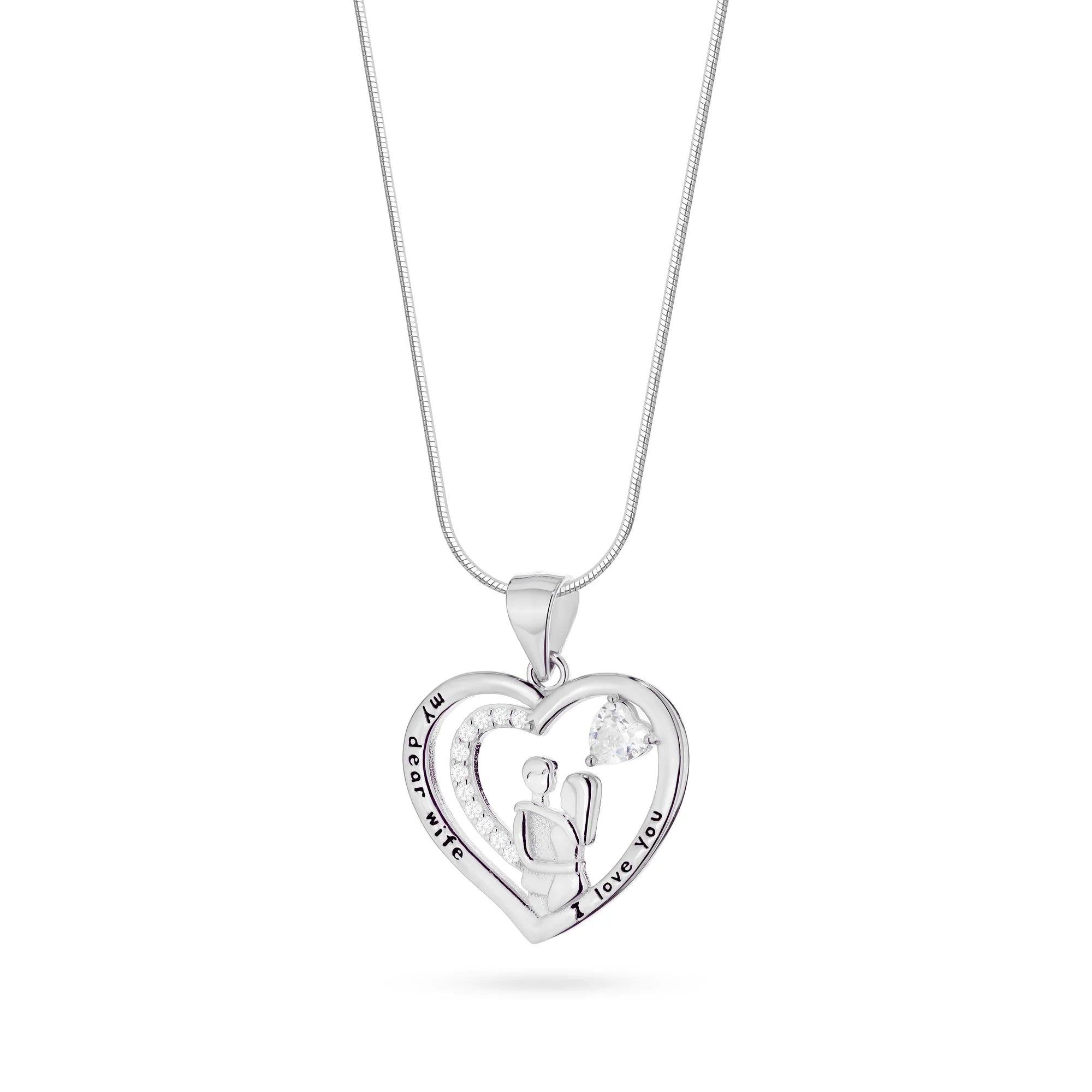 Silver Necklace with Lovers-in-Heart Pendant and Cubic Zirconia