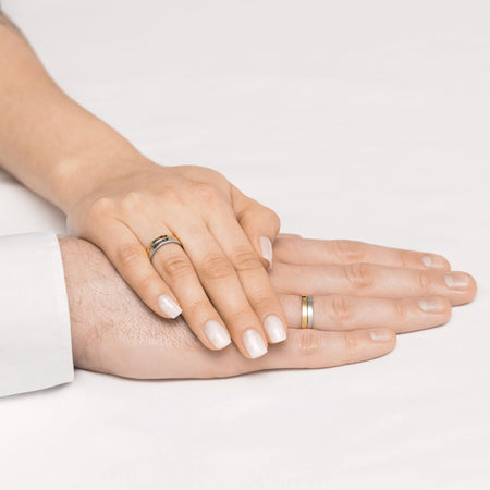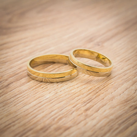 Flach zweifarbige Gold Trauringe Ringe 5mm Handgefertigt in der Gremari Schmuckwerkstatt, einzigartige klassische Trauringe aus einer 14K (585) Kombination aus Weiß- und Gelbgold, sind ein zeitloses Symbol ewiger Liebe. Der Ring, 5mm breit, sieht an der Hand wunderschön aus, ist dezent und passt perfekt zu anderen Schmuckstücken wie Armbändern oder Ringen mit Edelsteinen oder einem Verlobungsring. Jedes Paar Trauringe wird in unserer Werkstatt nach Kundenwunsch gefertigt. Es ist möglich, sie weiter zu personalisieren, indem eine Gravur mit eigenem Text hinzugefügt wird. Wir verpacken die Trauringe in einer eleganten Schmuckschatulle, die zum Charakter Ihrer Zeremonie passt.