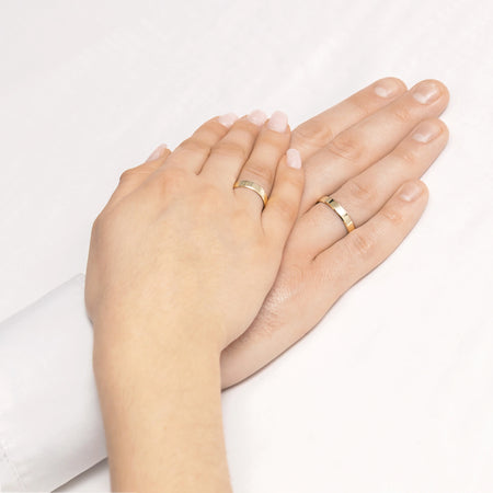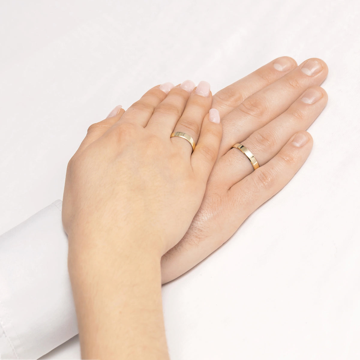 Klassische Flach Abgeschrägt Gold Eheringe 4mm Handgefertigt in der Gremari Schmuckwerkstatt, einzigartige klassische Eheringe aus 14K (585) Gold, sind ein zeitloses Symbol ewiger Liebe. Der Ring, 4mm breit und 1,2mm dick, sieht wunderschön an der Hand aus, ist dezent und passt perfekt zu anderen Schmuckstücken wie Armbändern oder Ringen mit Edelsteinen oder einem Verlobungsring. Wir bieten Gold-Eheringe in drei edlen Farbtönen an: klassisches Gelbgold begeistert mit seinem warmen Glanz und ist ein zeitloses Symbol der Ehe; elegantes Weißgold hat einen modernen, kühlen, spiegelähnlichen Glanz, der an Platin erinnert; während romantisches Roségold mit seinem dezenten, warmen und modischen Farbton verzaubert. Jedes Paar Eheringe wird in unserer Werkstatt nach Kundenwunsch gefertigt. Es ist möglich, sie durch eine Gravur mit eigenem Text weiter zu personalisieren. Wir verpacken die Eheringe in einer eleganten Schmuckschatulle, die zum Charakter Ihrer Zeremonie passt.